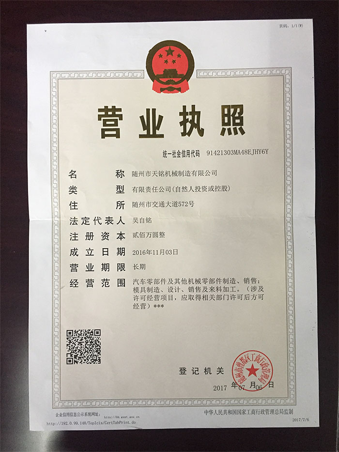 隨州市天銘機(jī)械制造有限公司地處中國(guó)專用汽車(chē)之都、炎帝神農(nóng)故里、編鐘古樂(lè)之鄉(xiāng)、歷史文化名城圣地車(chē)都—---隨州,是2015創(chuàng)立的新興企業(yè);主要生產(chǎn)汽摩配、機(jī)械設(shè)備系列鋁合金零部件的專業(yè)化公司,具有年產(chǎn)各類零部件10萬(wàn)臺(tái)套的生產(chǎn)能力;公司致力于發(fā)展智能化,自動(dòng)化汽車(chē)配套產(chǎn)品。目前已有智能高壓灑水炮產(chǎn)品,并獲得兩項(xiàng)國(guó)家專利(實(shí)用新型專利 專利號(hào):ZL 2016 2 0962285.1 外觀設(shè)計(jì)專利 專利號(hào):ZL 2016 3 0428566.4 )。公司著重以減輕人力操作強(qiáng)度為發(fā)展方向,升級(jí)產(chǎn)品,升級(jí)工藝。向技術(shù)要效益,向工藝要產(chǎn)值,向品質(zhì)要客戶!努力實(shí)現(xiàn)上中下游共贏!